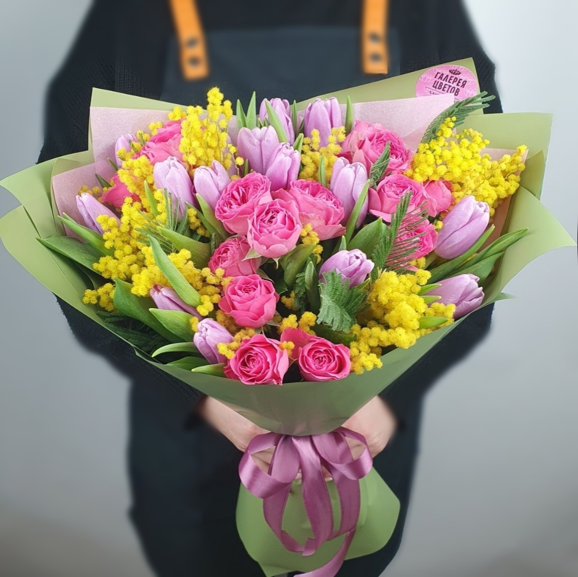 Состав: тюльпан 17шт, роза кустовая пионовидная 4шт, мимоза 2шт, упаковка, лента